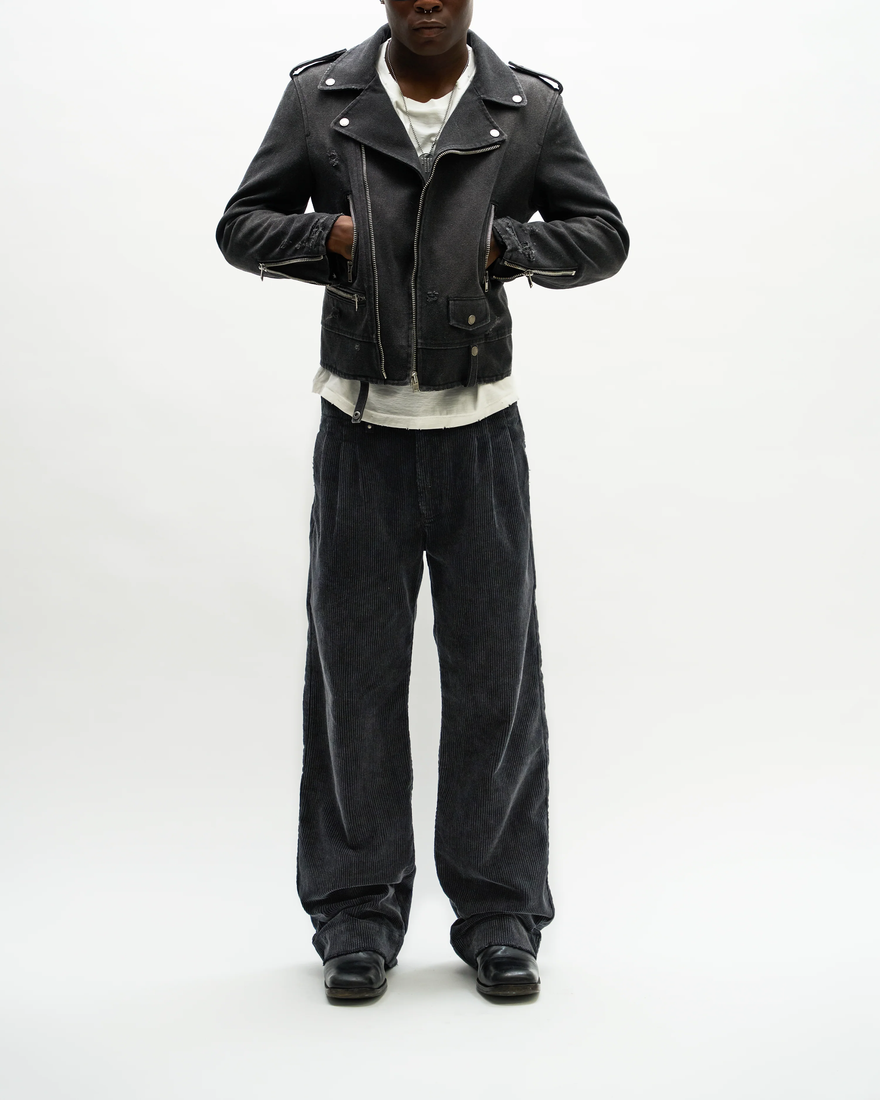 Just the right amount of width. The outseam is as straight as it gets. 3 pleats on each leg. Antique silver studs with little stars on the 2 front belt loops to keep things interesting. Double hook closure, with an inner button for added strength. Vintage washed 100% cotton corduroy.