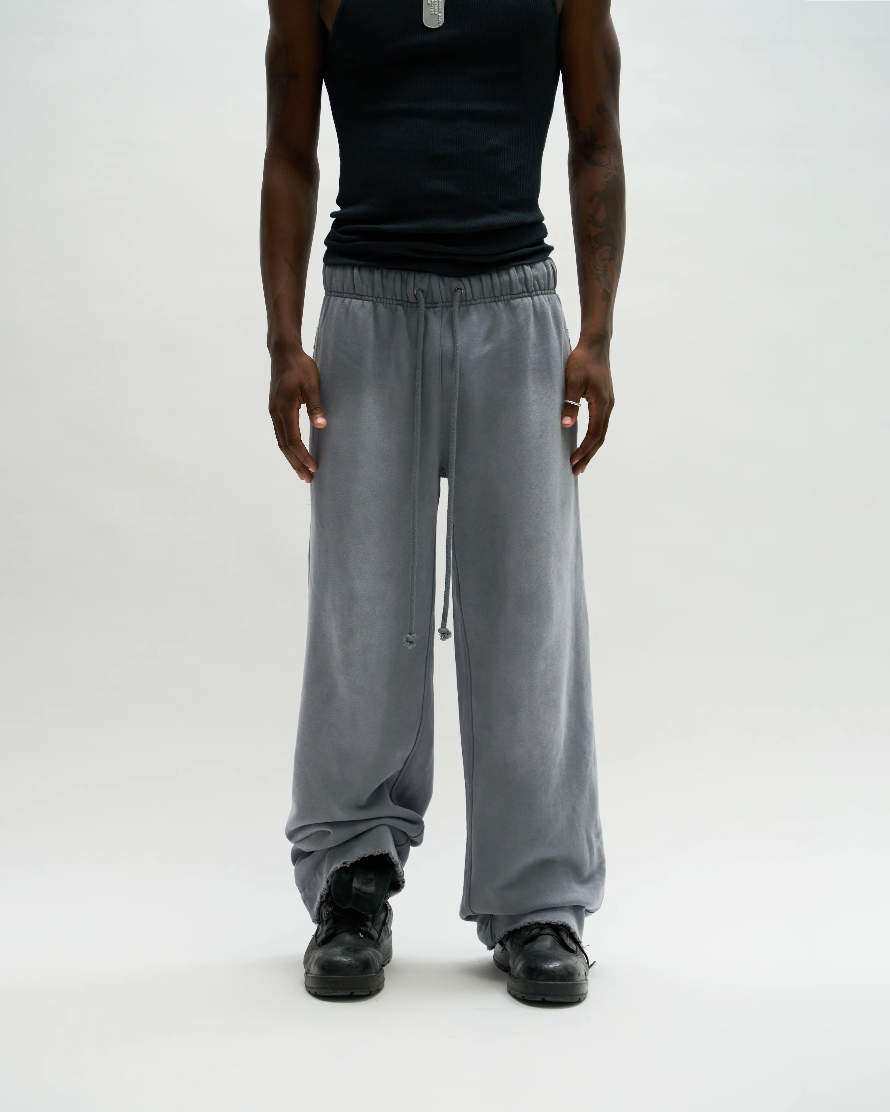 Low rise. 500gsm n cozy. Custom milled 100% French Terry cotton. Took multiple tries to get the sunfading right, but I think we perfected it. Straight leg fit that can be dressed up or down. Under the left pocket you’ll find our signature antique silver rivet. Long rope drawstrings that swing.